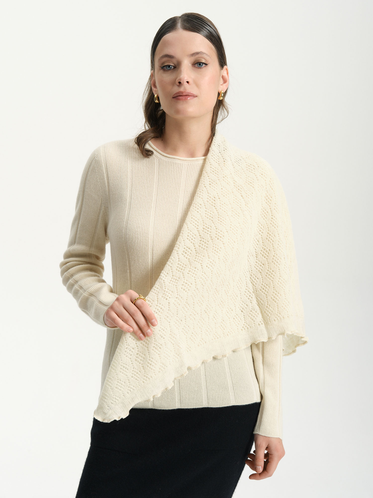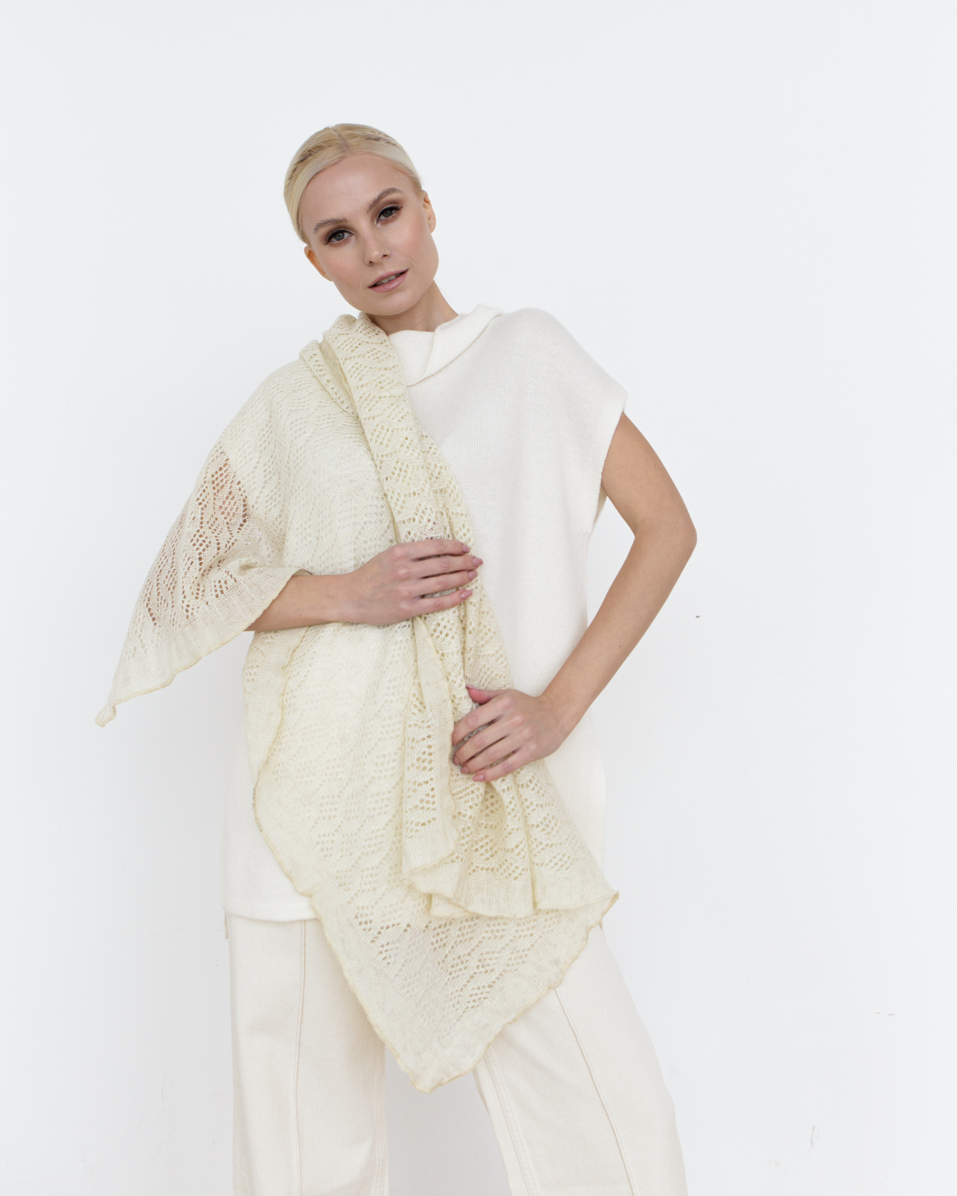 Модель выполнена в форме косынки с аккуратной фактурной вязкой и плавной линией края. Универсальная форма позволяет красиво драпировать платок и носить его различными способами.