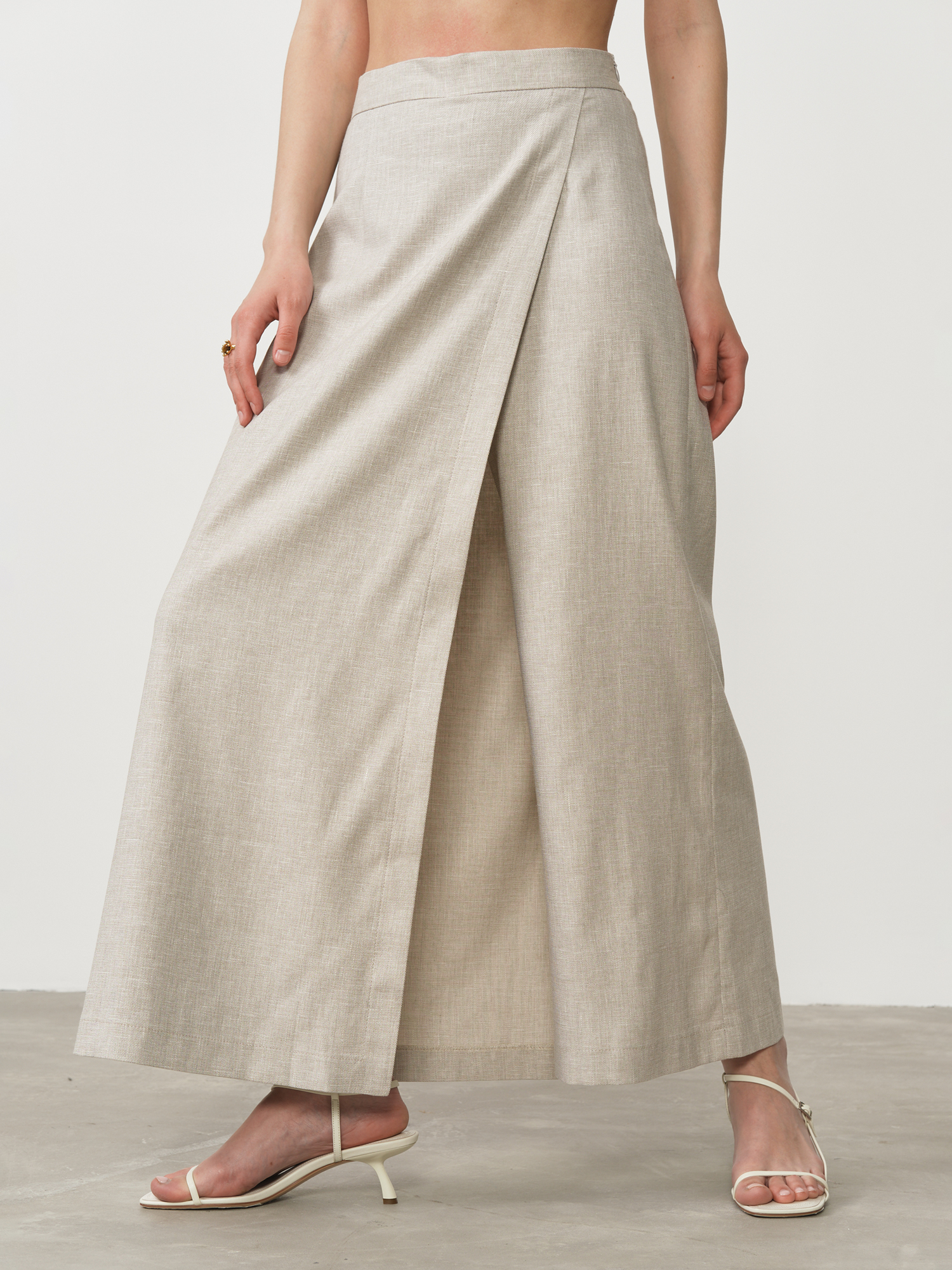 Эффект запаха с аккуратной драпировкой спереди, скрытая конструкция брюк, чистая линия по талии, аккуратные швы.