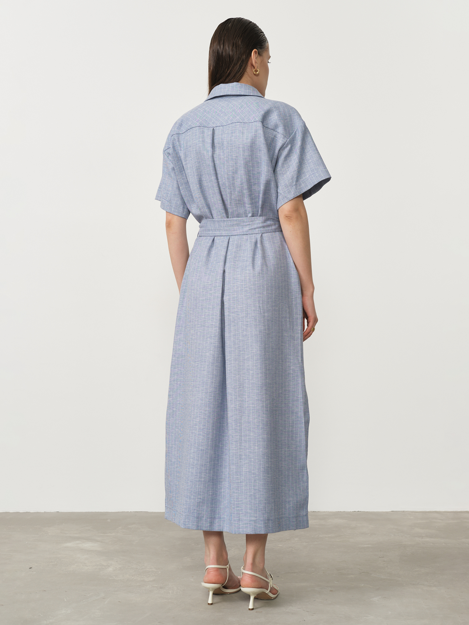 Прямой силуэт с мягким акцентом на талии. Верх выполнен в рубашечном стиле с воротником и застёжкой, что придаёт образу аккуратность и структуру.