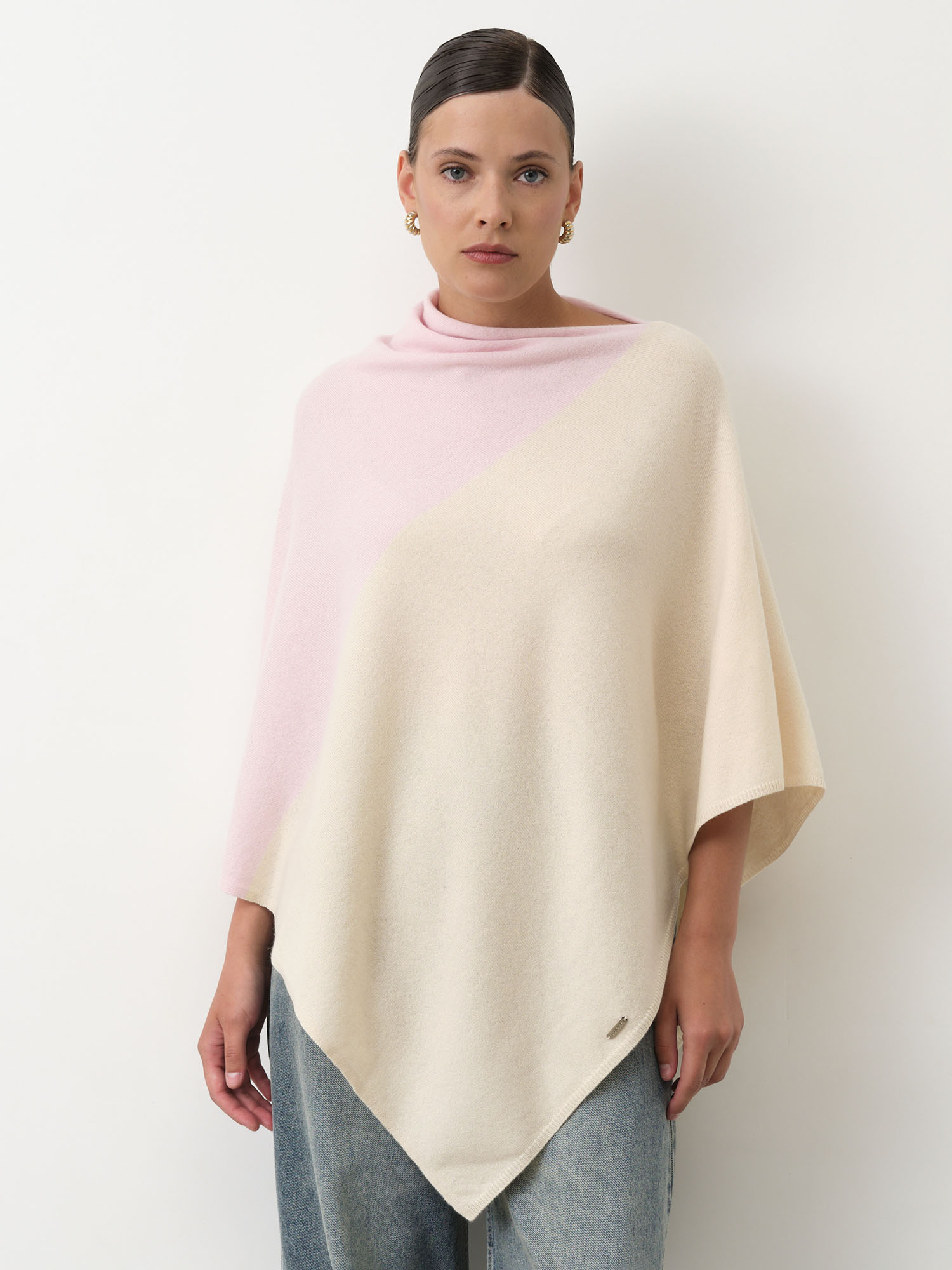 Обожаю это пончо: натуральная шерсть, лёгкость и невероятное тепло. Асимметрия смотрится стильно, а кремово-розовый тон добавляет нежность.