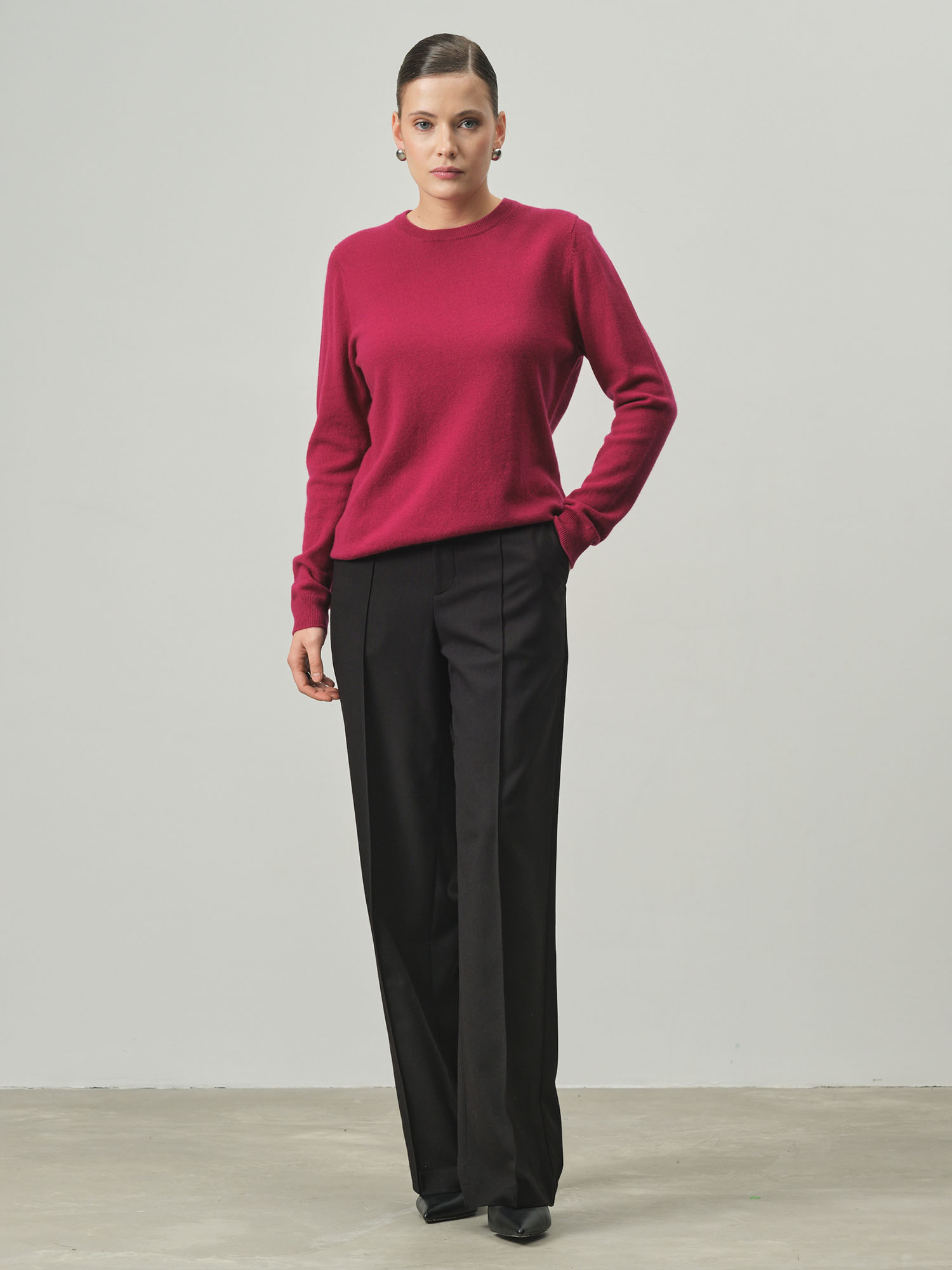 Богатый оттенок спелого баклажана добавляет образу глубину и изысканность. Этот цвет одинаково эффектно смотрится как в деловых ансамблях с юбкой-карандаш, так и в вечерних луках с шелковыми брюками или в повседневных сочетаниях с денимом. Умеренно приталенный силуэт с классическим круглым вырезом подчеркивает женственность, сохраняя при этом универсальность.
