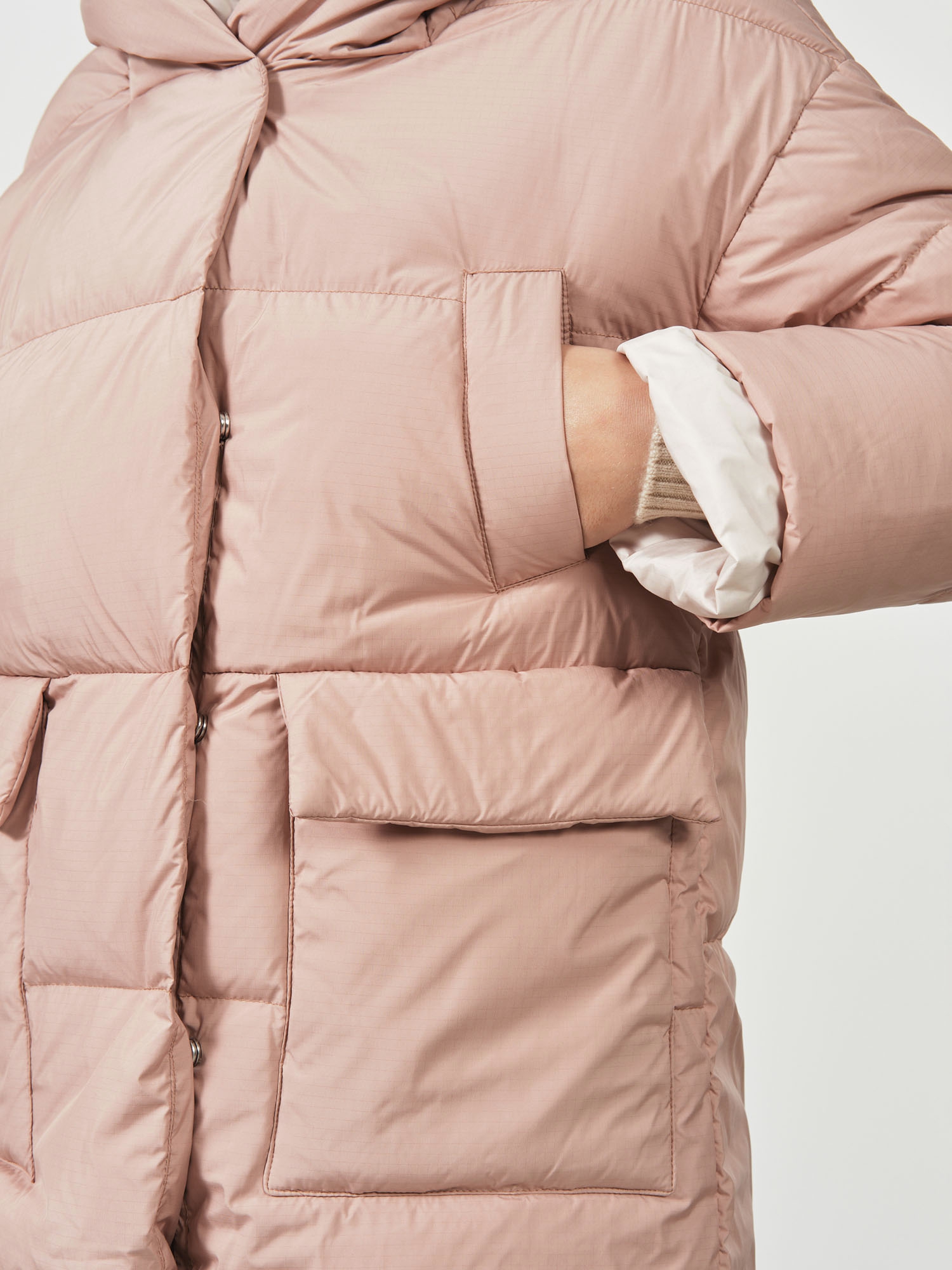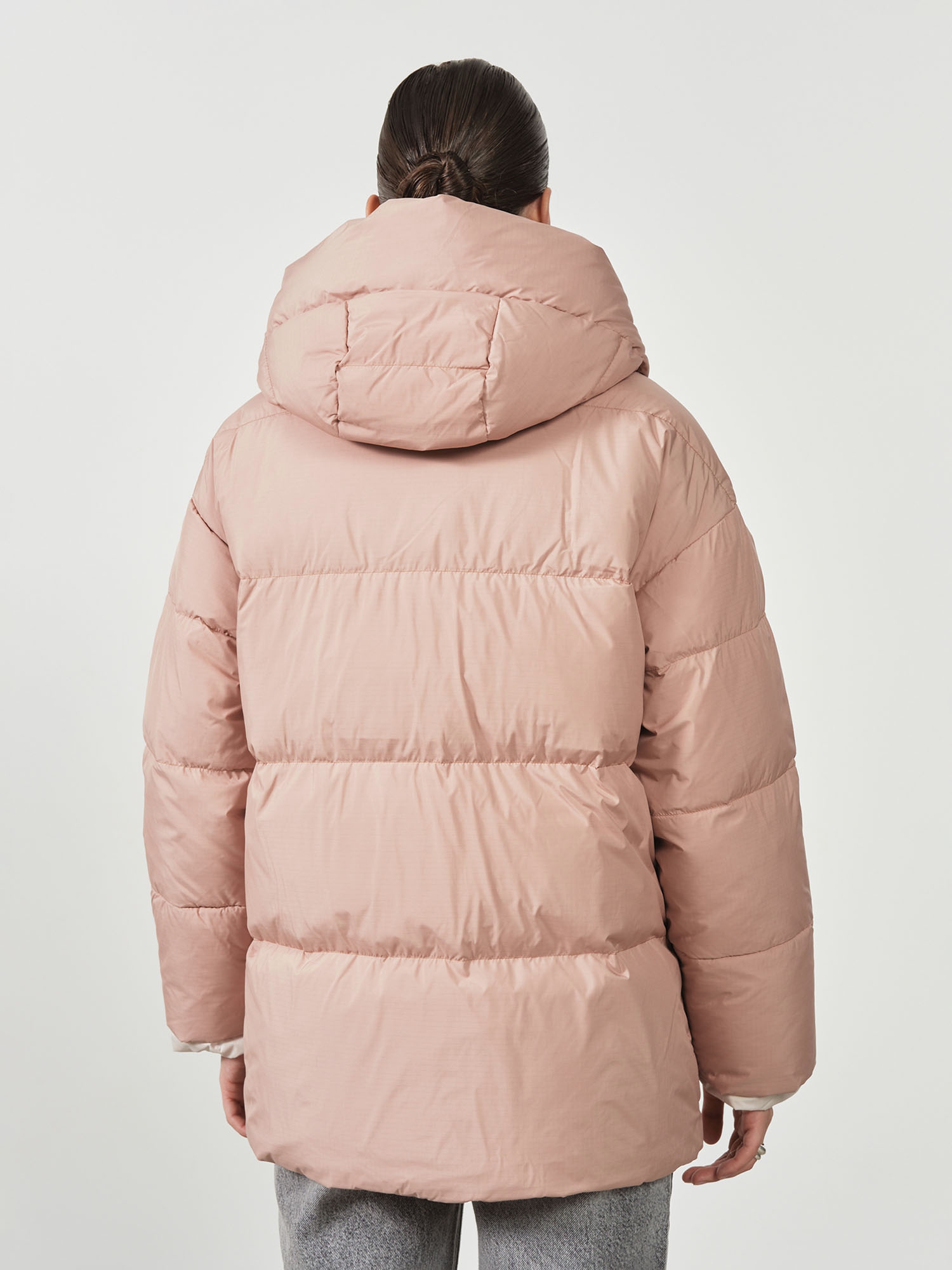 Женская куртка выполнена в нежном пудровом оттенке и сочетает актуальный дизайн с комфортом для холодного сезона. Модель имеет современный объемный силуэт и выглядит стильно в повседневных и городских образах.
